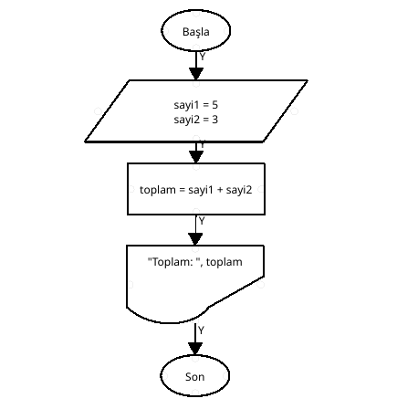 Sabit değer atanan sayi1, sayi2 değişkenlerinin önce toplam işlemini yapan ve toplam değişken sonucunu gösteren(çıktı) programın akış şemasını yapınız.
