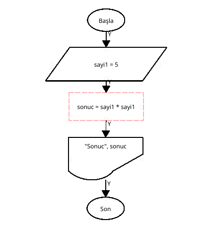 sayi1 değişkenine 5 sayısını atayan ve bu sayının kendisiylle çarpımının(karesi) hesaplayıp sonuc değişkeninin değerini gösteren(çıktı) programın akış şemasını yapınız.