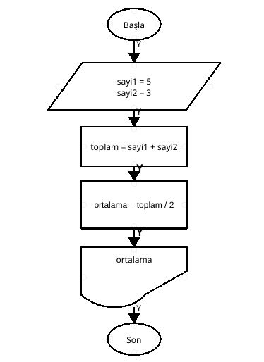 Sabit değer atanan sayi1, sayi2 değişkenlerinin önce toplam işlemini yapan ve toplam değişkeni ikiye bölerek ortalama değikenine atayan ve ortalama değişkenini gösteren(çıktı) programın akış şemasını yapınız.