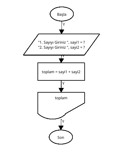 Dışarıdan(klavyeden) sayi1 ve sayi2 değişkenine girilen(Girdi) değerleri toplam değişkenine toplayan ve ekrandda toplam değerini gösteren(çıktı) programın akış şemasını yapınız.