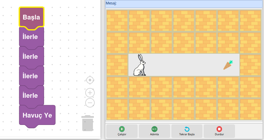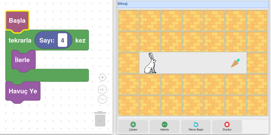 Problemde 3 defa sağa ok kullanılmalıdır. Fakat bu işmlemdeki adım sayısı 200 olsaydı bu blogları altalta eklemek sorun olacaktı. Bu işlemi tekrar bloğu kullanarak yapacağız. Çözüm aşağıda gösterilmiştir.