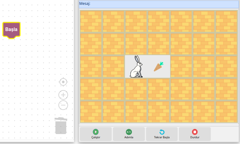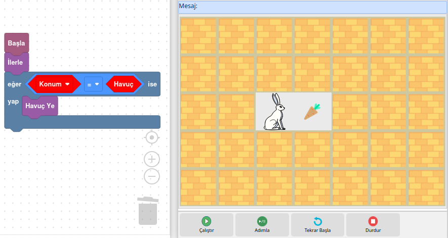 ilerle kodumuzla hedefe ulaşılmaktadır. Hedefe ulaşıldığında hedefte havuç olup olmadığını konum=havuc şartıyla kontrol etmekteyiz. Burada Havuç Ye komutunun çalışma şartı havuç olmasına bağlı olarak karar verilmektedir. Şart sonucu evetse Havuç Ye komutunun çalışmasını sağlayan kodumuz bulunmaktadır.