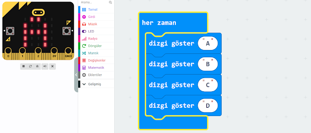 Döngüler blog içindeki kodları tekrar tekrar çalıştıran yapılardır. Microbitte sürekli tekrar eden tekrar bloğu "Her Zaman" bloğudur.