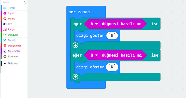 Aşağıda ise A butonuna basınca ismimizin baş harfi ve B butonuna basınca soyadımızın baş harfini ekrana yazan kod bulunmaktadır.